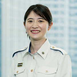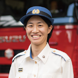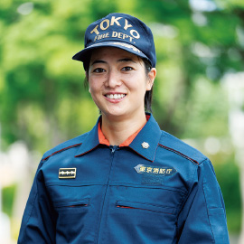 ポンプ小隊長として勤務しています。同じ隊で勤務する仲間とのコミュニケーションを大切にし、女性ならではの気づきや気遣い、視野の広さが部隊全体の強さに繋がっていると感じています。東京消防庁では男女関係なく必ず輝ける場所があります。一緒に頑張りましょう!